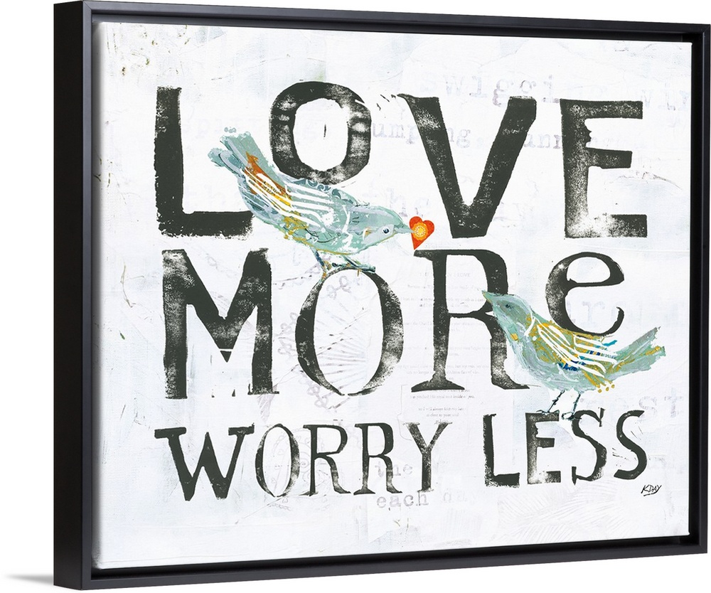 <p>"Love More Worry Less" with two birds and faint text on the background, created with mixed media.</p>
