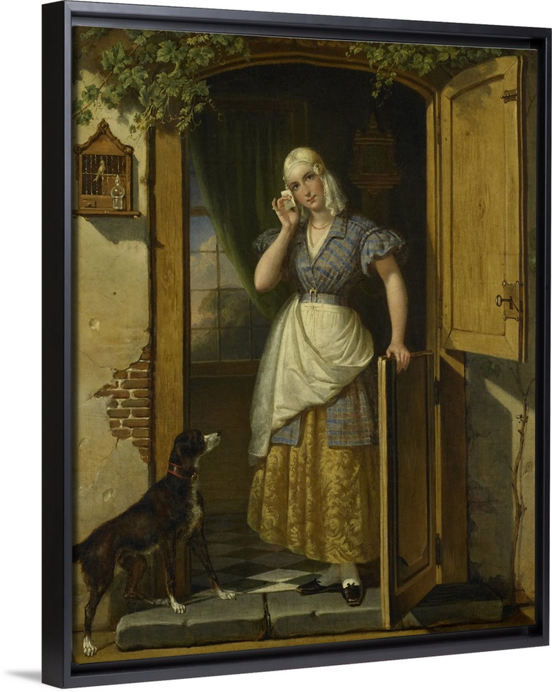 <p>Love Note, by Johannes Hendrik van West, 1838, Dutch painting, oil on canvas. A young woman in the doorway of a house holding a letter to her head. Painting details include a caged bird, a dog, a Dutch door, and wall clock.</p>