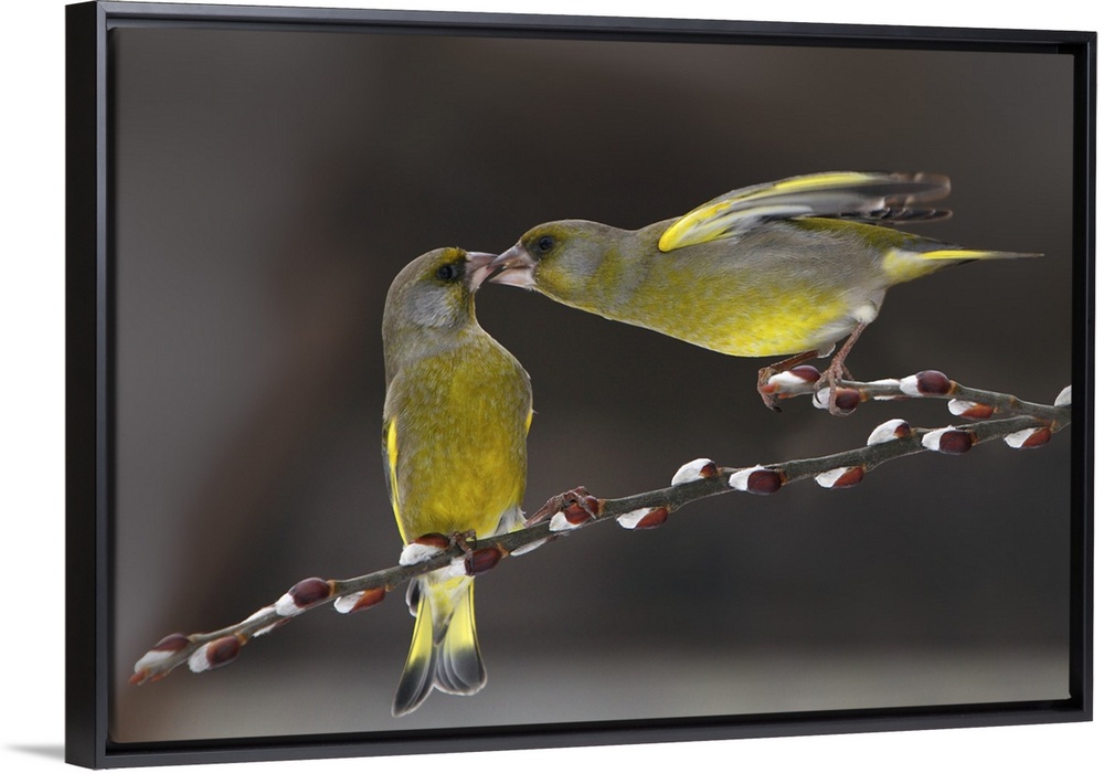 <p>Cute image of two Green Finches in love balancing on a thin branch.</p>