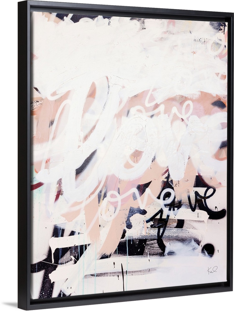 <p>A contemporary grafitti style painting in neutral shades of black, pink and white and featuring the word Love spray painted multiple times</p>