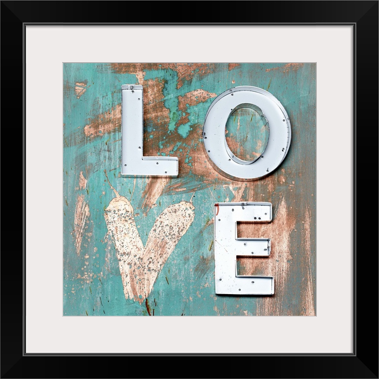 <p>The word "Love" made of metal letters and a painted heart on weathered teal boards.</p>