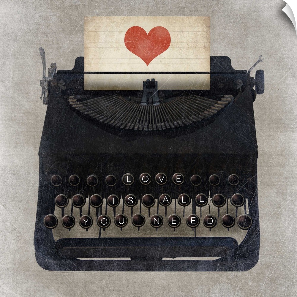 <p>A vintage typewriter with "Love is all you need" on the keys and a heart on the paper.</p>