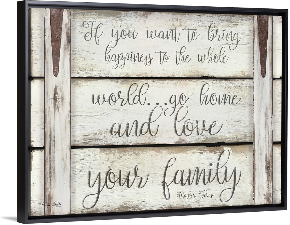 <p>Digital artwork of distressed wood panels featuring the words: If you want to bring happiness to the whole world... go home and love your family.</p>