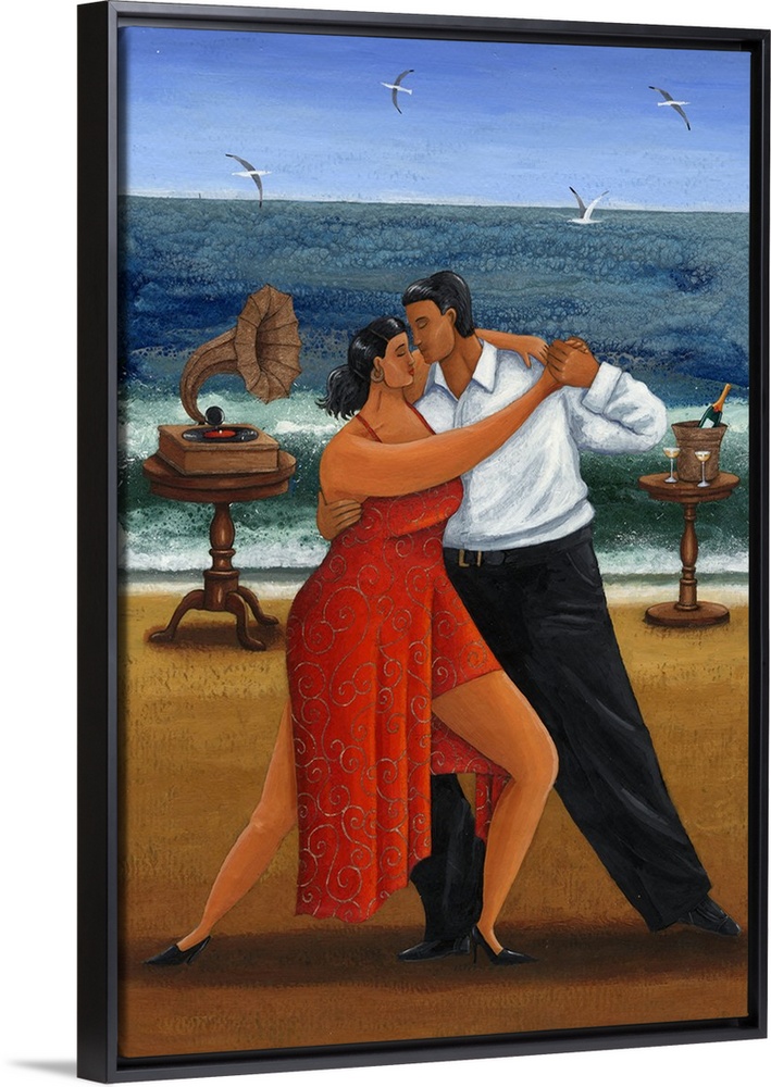 <p>Contemporary painting of a Latin couple dancing to music on a beach.</p>