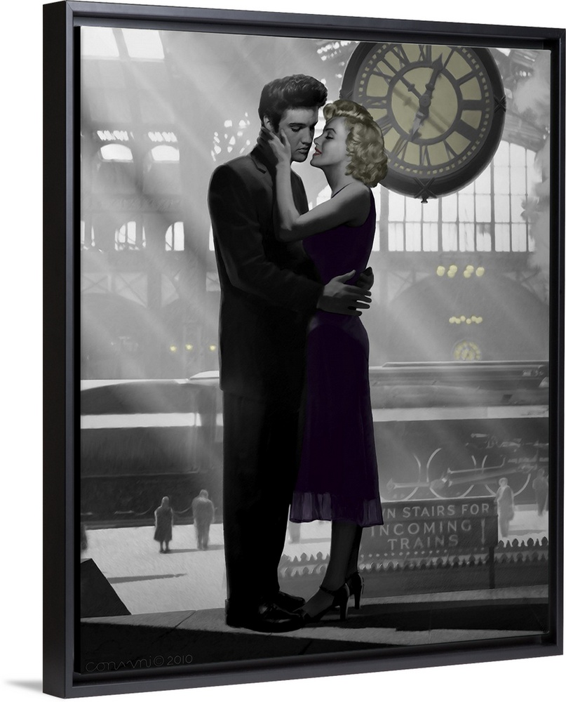 <p>Painting of Marilyn Monroe and Elvis Presley embracing in a train station.</p>