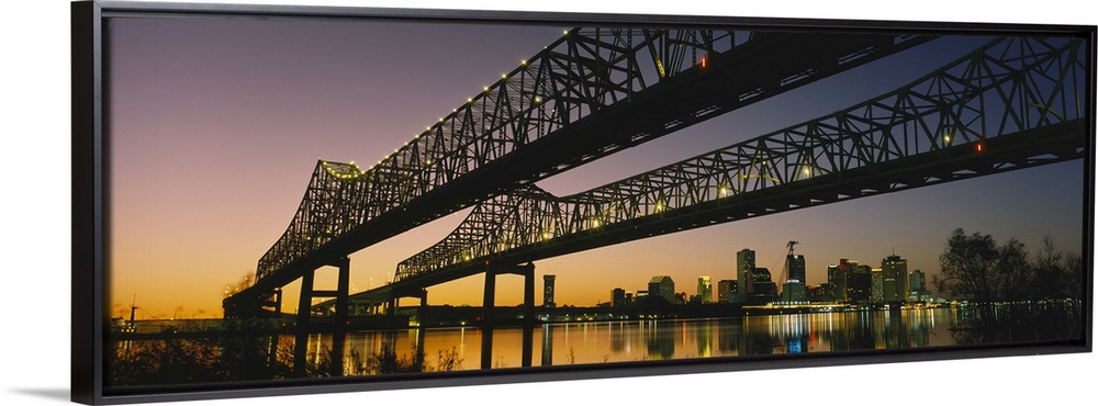 <p>Large panoramic photograph taken beneath a long bridge running across a river in New Orleans, Louisianna (LA). The city skyscrapers and bright lights are reflected in the river.</p>