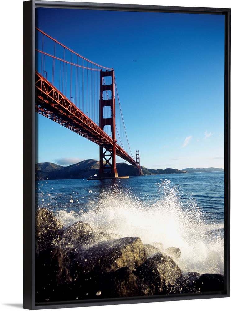 <p>Huge photograph displays a rocky shoreline being beaten with water from the surrounding bay in the very near foreground, while within the rest of the picture, a famous overpass located within the Western United States can be seen extending into the distance. The curved and straight lines of the cables and supports of this suspension overpass travel the entire distance of it as it leads into a mountainous landscape in the distance.</p>