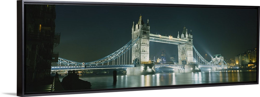 <p>Panoramic photograph taken of the London tower bridge illuminated under a dark night sky.</p>