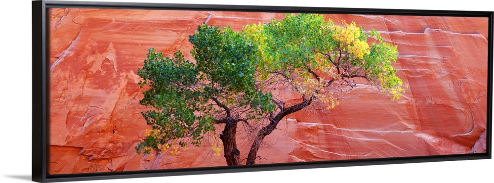 <p>Big panoramic photo on canvas of a tree contrasted in front of a large red rock formation.</p>
