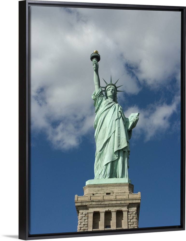 <p>Vertical, low angle photograph on a big canvas, looking up at the Statue of Liberty against a blue sky with thin white clouds.</p>