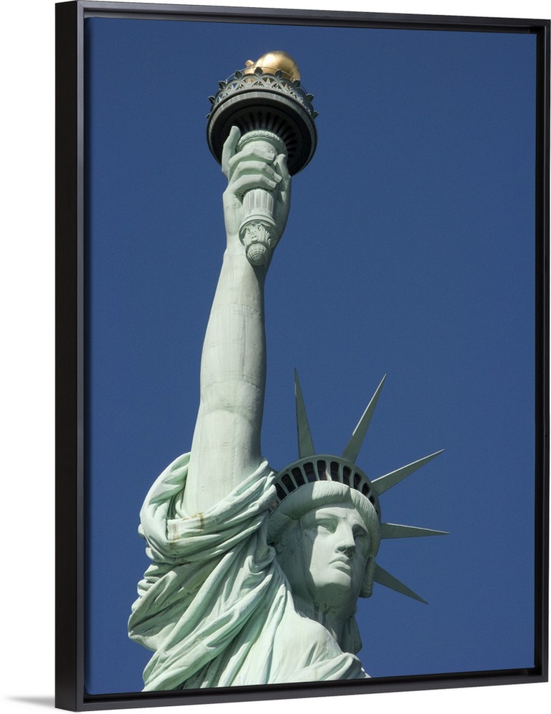<p>Photograph taken from below the statue of liberty that shows her from the chest and up.</p>