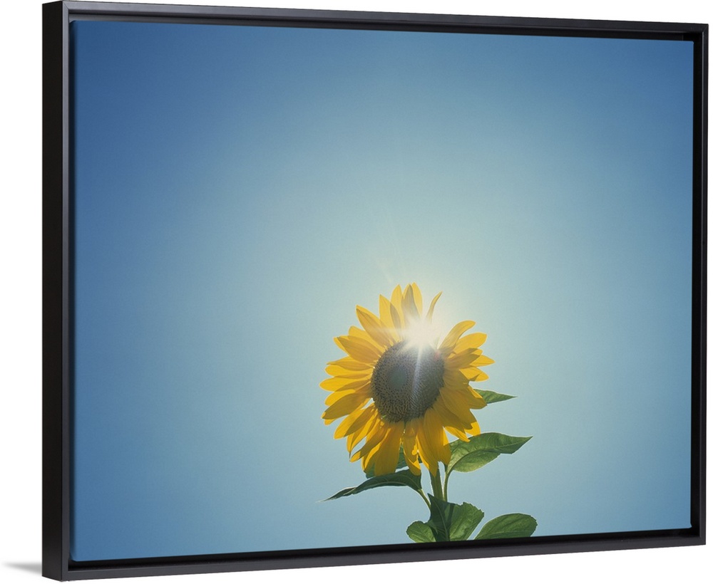 <p>This is a photograph taken of a flower against an empty sky with the sun directly behind the blossom.</p>