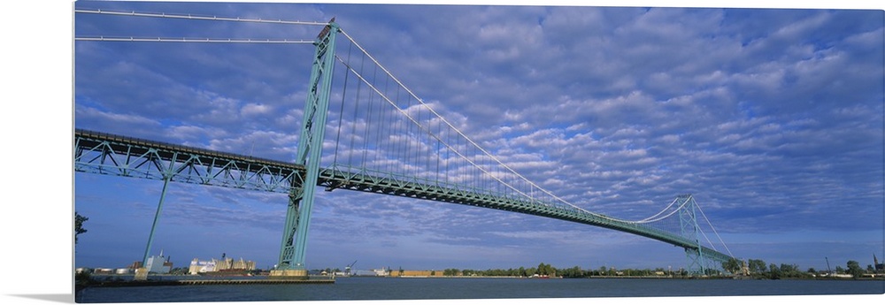 <p>Long and horizontal image print of a long bridge spanning across the river in Detroit.</p>