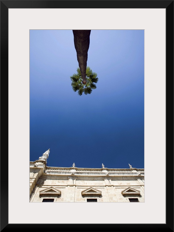 <p>Low angle view of a tall palm tree and the top of Seville's University building, Seville, Spain</p>