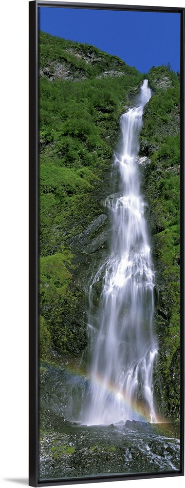 <p>Vertical panoramic photograph of water cascading over rocks with small rainbow at the bottom.</p>