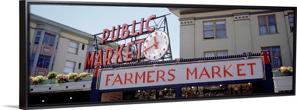 <p>Long canvas print of the Farmer's Market sign in Seattle with the entrance seen below.</p>