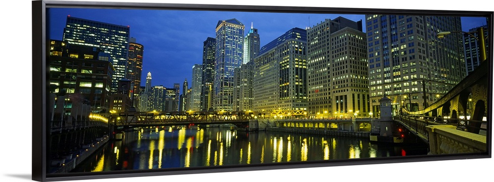 <p>Long canvas of the Chicago River with the city lit up around it.</p>