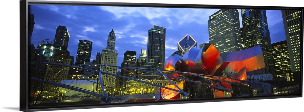 <p>A panoramic shaped wall hanging shows the interior of a city park looking up at the skylineos skyscrapers.</p>
