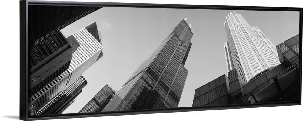 <p>View from the bottom looking up at big buildings in Chicago on canvas.</p>