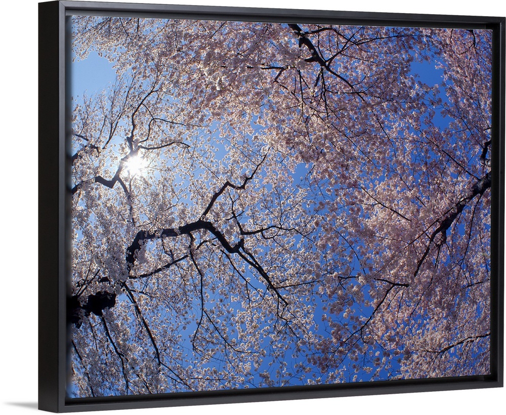 <p>Landscape, low angle photograph on a big canvas looking up through blooming cherry blossom trees beneath the sun, in Washington DC.</p>