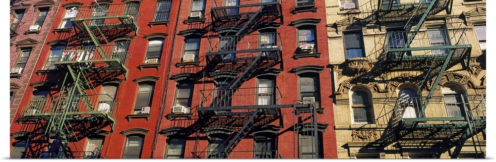 <p>Panoramic image of iron fire ladders on the sides of apartment buildings in an urban city, creating industrial patterns.</p>