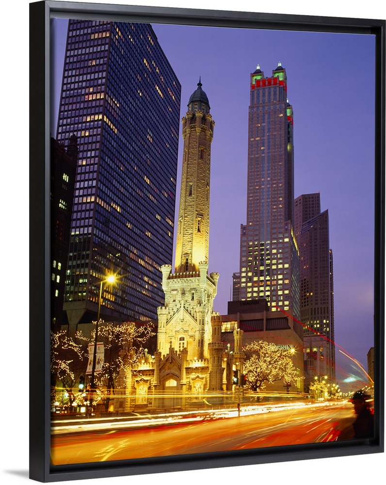 <p>Vertical photo taken from street level in Chicago looking up and a lit up old church with a modern day skyscraper behind.</p>