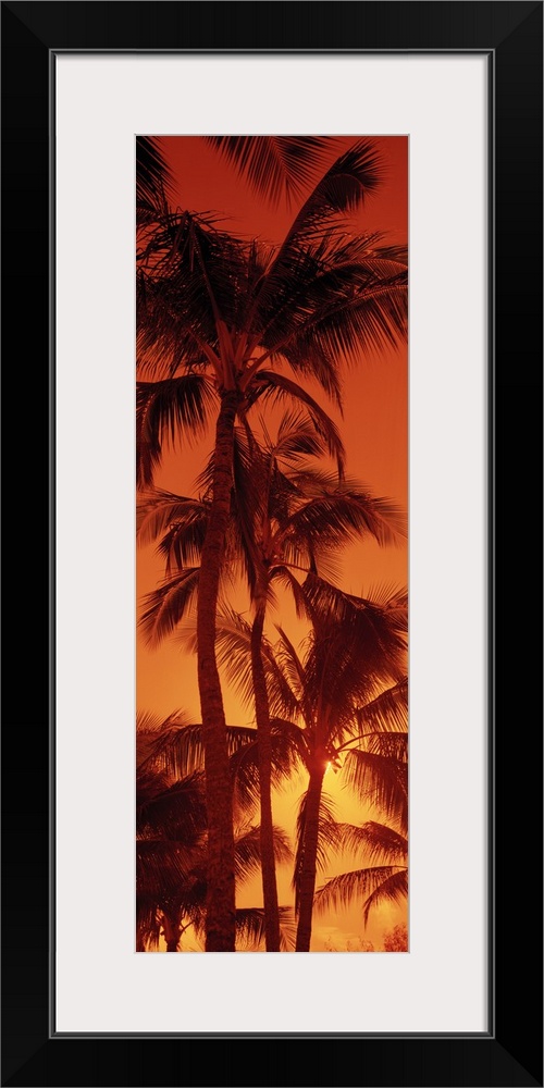 <p>Giant, vertical photograph looking up at a row of tall palm trees against a fiery sunset at Kalapaki Beach, in Kauai, Hawaii.</p>