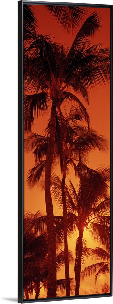 <p>Giant, vertical photograph looking up at a row of tall palm trees against a fiery sunset at Kalapaki Beach, in Kauai, Hawaii.</p>
