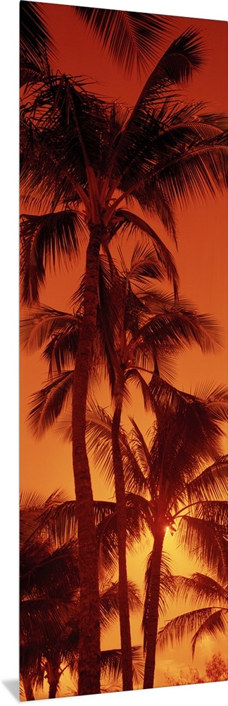 <p>Giant, vertical photograph looking up at a row of tall palm trees against a fiery sunset at Kalapaki Beach, in Kauai, Hawaii.</p>