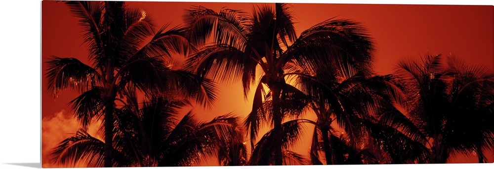 <p>Large panoramic upward shot of the tops of palm trees at sunset at Kalapaki Beach, Kauai, Hawaii (HI). The setting sun is visible thorugh the tall trees and showers warm sunlight all over.</p>