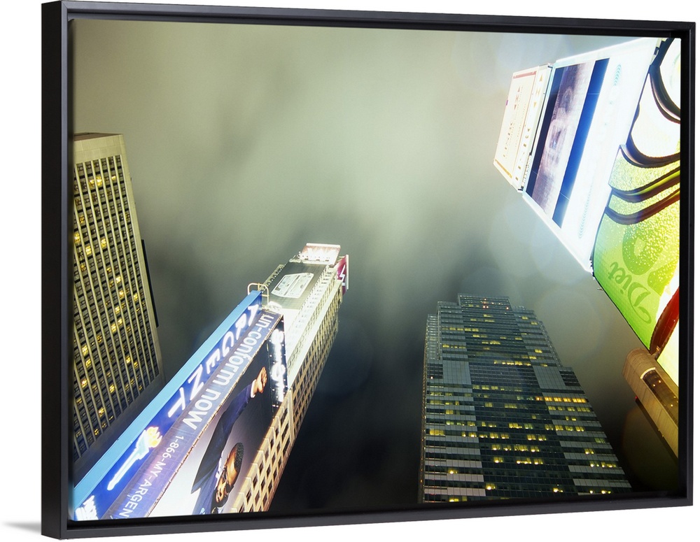 <p>Oversized, landscape photograph from a low angle of several skyscrapers and lit advertising signs in Times Square, New York City. The tops of the buildings surrounded by a hazy night sky.</p>