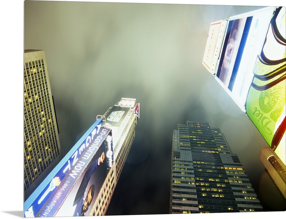 <p>Oversized, landscape photograph from a low angle of several skyscrapers and lit advertising signs in Times Square, New York City. The tops of the buildings surrounded by a hazy night sky.</p>