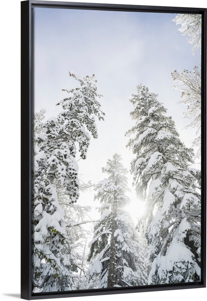<p>Low angle view of snow covered trees and sunlight glowing through them to a blue sky with cloud</p>