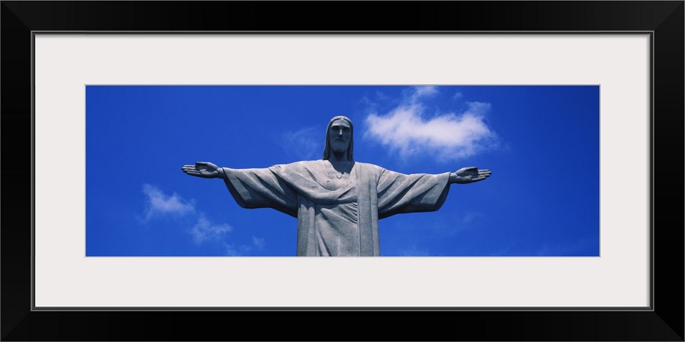 <p>Panoramic, low angle photograph of the Christ the Redeemer statue, from the waist up, against a bright blue sky, in Rio de Janeiro, Brazil.</p>