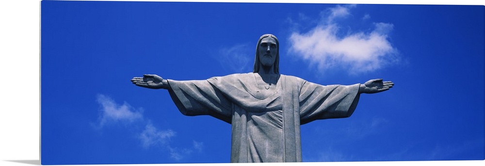 <p>Panoramic, low angle photograph of the Christ the Redeemer statue, from the waist up, against a bright blue sky, in Rio de Janeiro, Brazil.</p>