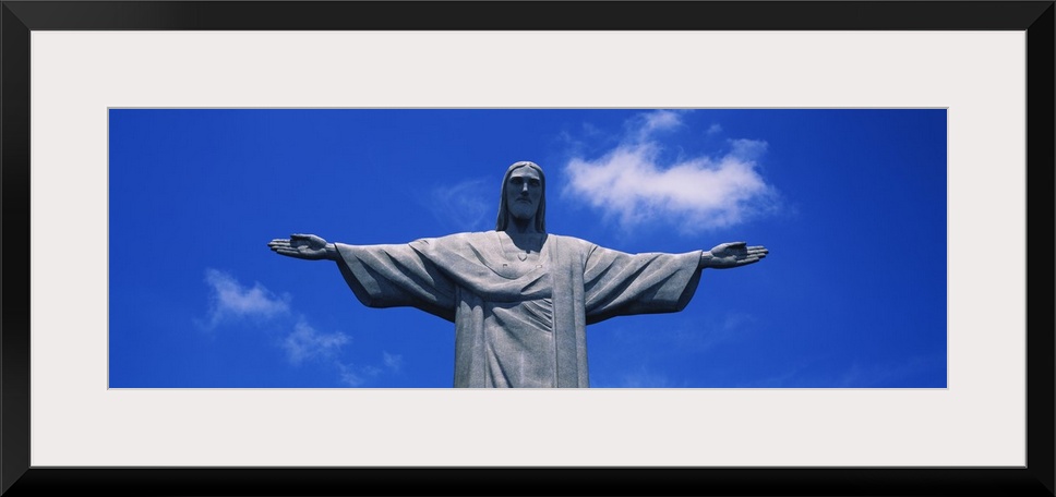 <p>Panoramic, low angle photograph of the Christ the Redeemer statue, from the waist up, against a bright blue sky, in Rio de Janeiro, Brazil.</p>