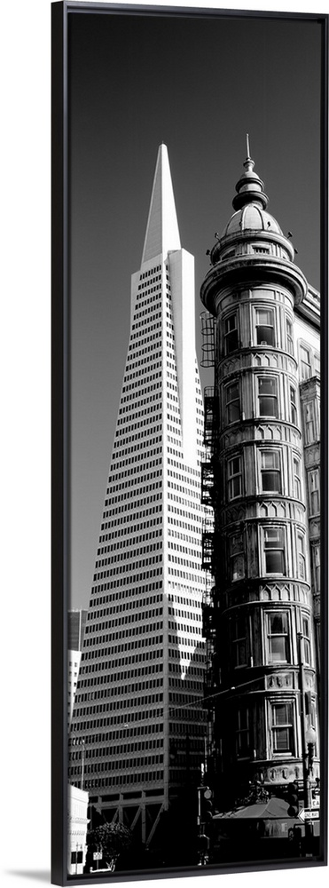 <p>Low angle view of towers, Columbus Tower, Transamerica Pyramid, San Francisco, California, USA.</p>