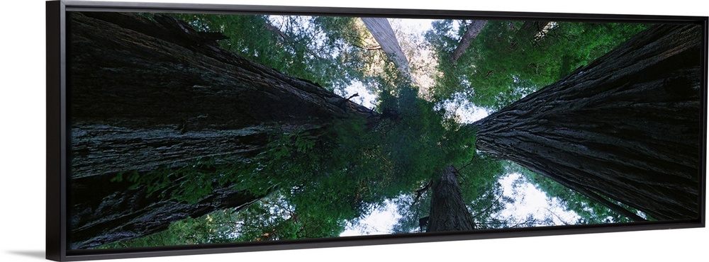 <p>A photograph is taken while lying on the ground and looking straight up through the tops of Redwood trees.</p>