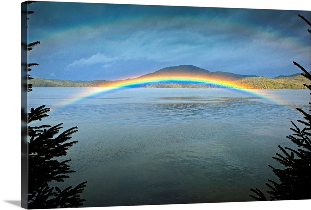 <p>Large landscape photograph of a rainbow over the rippling waters of Clover Passage, in Ketchikan, Southeast Alaska in early summer. Betton Island is in the background, beneath a partly cloudy sky.</p>