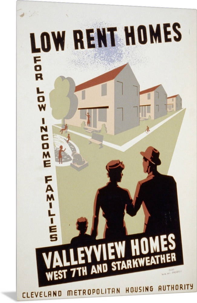 <p>Artwork for Cleveland Metropolitan Housing Authority announcing new low income housing development, showing family looking at new homes.</p>