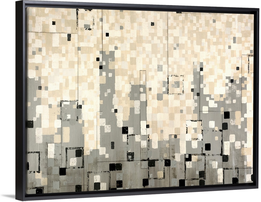 <p>Huge abstract art includes a variety of different sized small squares and rectangles layered on top and next to each other with a few highlights of horizontal and vertical lines dispersed throughout this piece.</p>