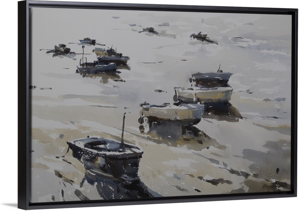 <p>This contemporary artwork features dry watercolor brush strokes and heavy shadows to create boats on dry land during low tide in sunset.</p>