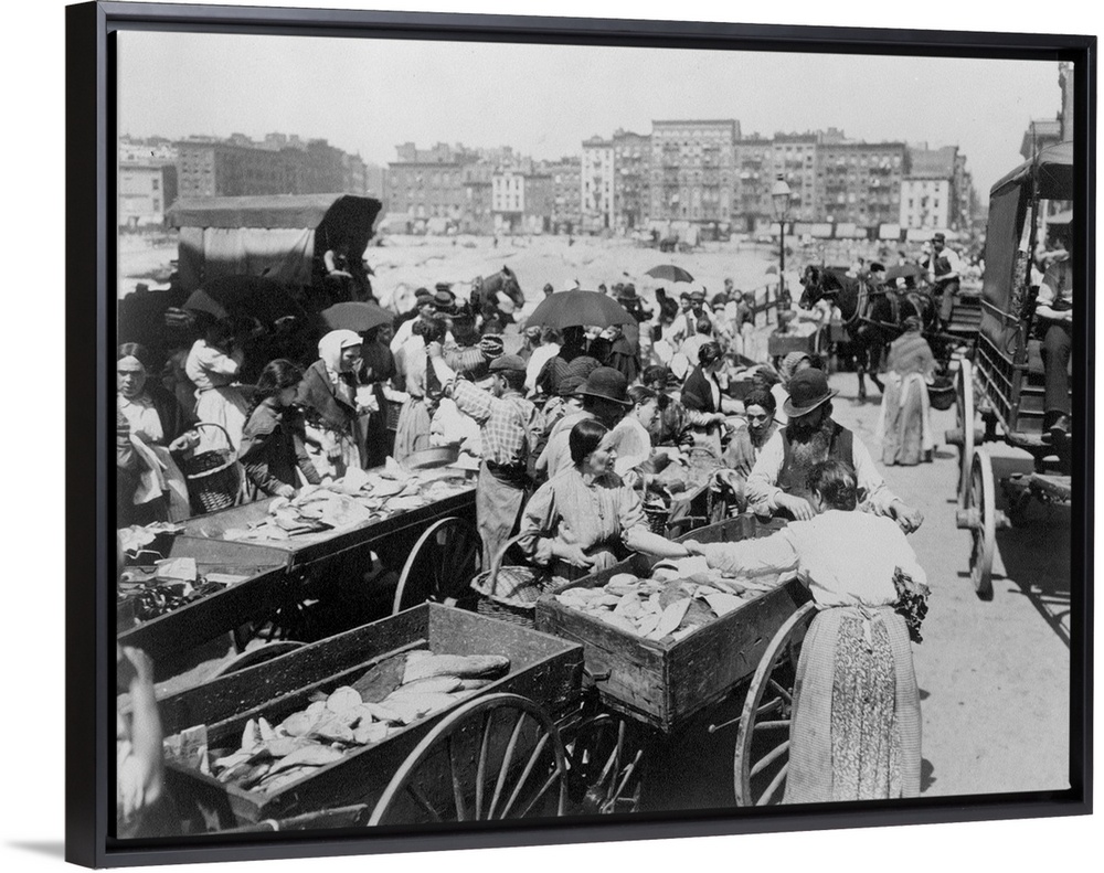 <p>The intersection of Hester Street (at right) and Suffolk Street, with Essex Street in the background. Photograph, c1898.</p>