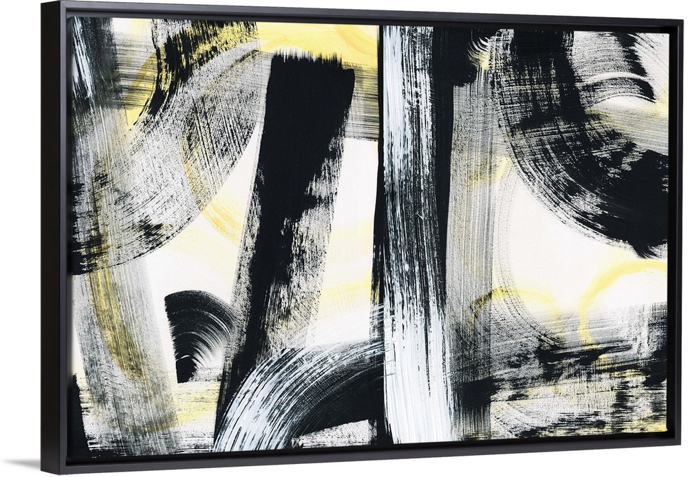<p>Large abstract painting with thick black and white brushstrokes creating lines and circles in the foreground and faint yellow circles in the background.</p>