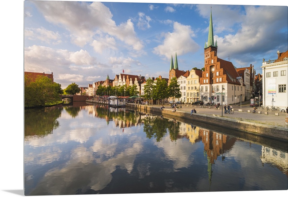<p>Lubeck, Baltic coast, Schleswig-Holstein, Germany. Old town's houses along the Trave river's waterfront.</p>