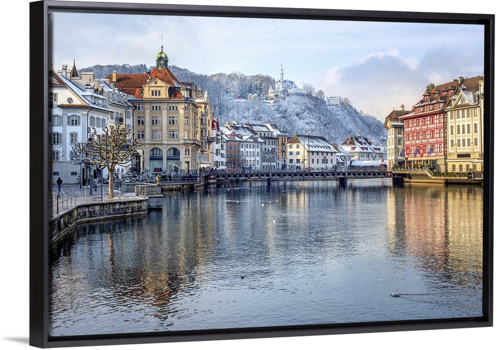 <p>Lucerne city, Switzerland, view of the Old Town covered with white snow in winter, reflecting in the river.</p>