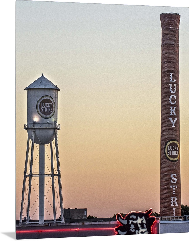 <p>Lucky Strike Water Tower and Smokestack at sunset, over the neon Bull sign, American Tobacco Historic District, Durham, North Carolina.</p>