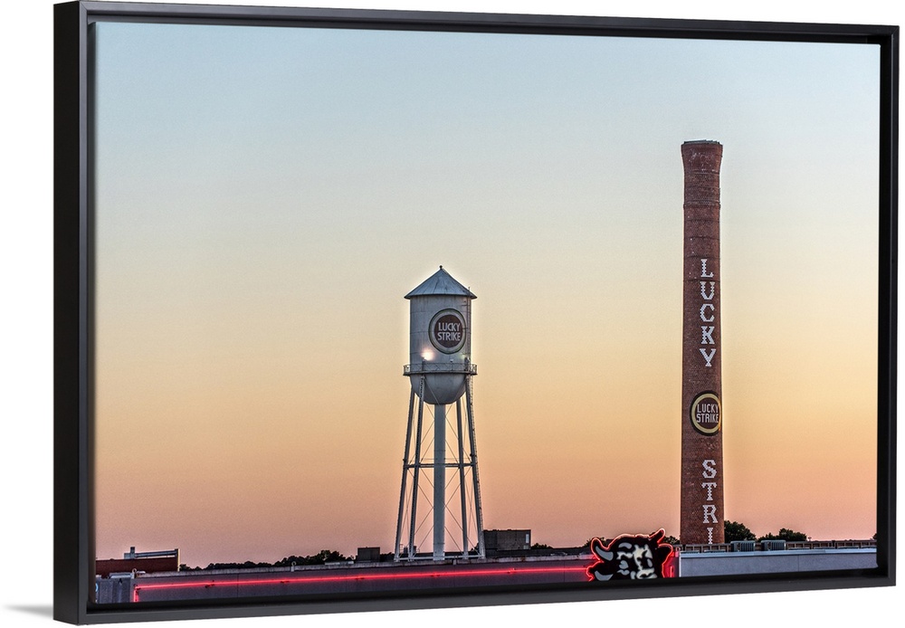 <p>Lucky Strike Water Tower and Smokestack at sunset, over the neon Bull sign, American Tobacco Historic District, Durham, North Carolina.</p>
