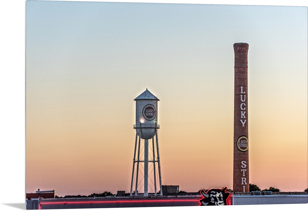 <p>Lucky Strike Water Tower and Smokestack at sunset, over the neon Bull sign, American Tobacco Historic District, Durham, North Carolina.</p>