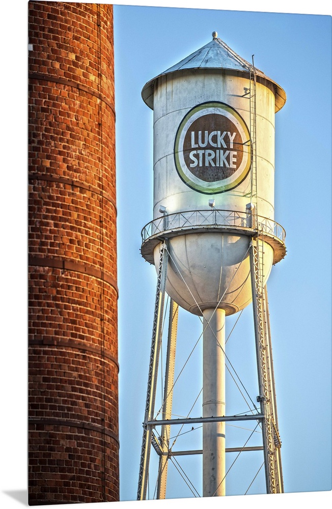 <p>Lucky Strike Water Tower and Smokestack at sunset, American Tobacco Historic District, Durham, North Carolina.</p>
